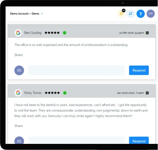 You can monitor and reply to reviews with push of a button. Send review requests right from the dashboard, no need for emails or text messages anymore!